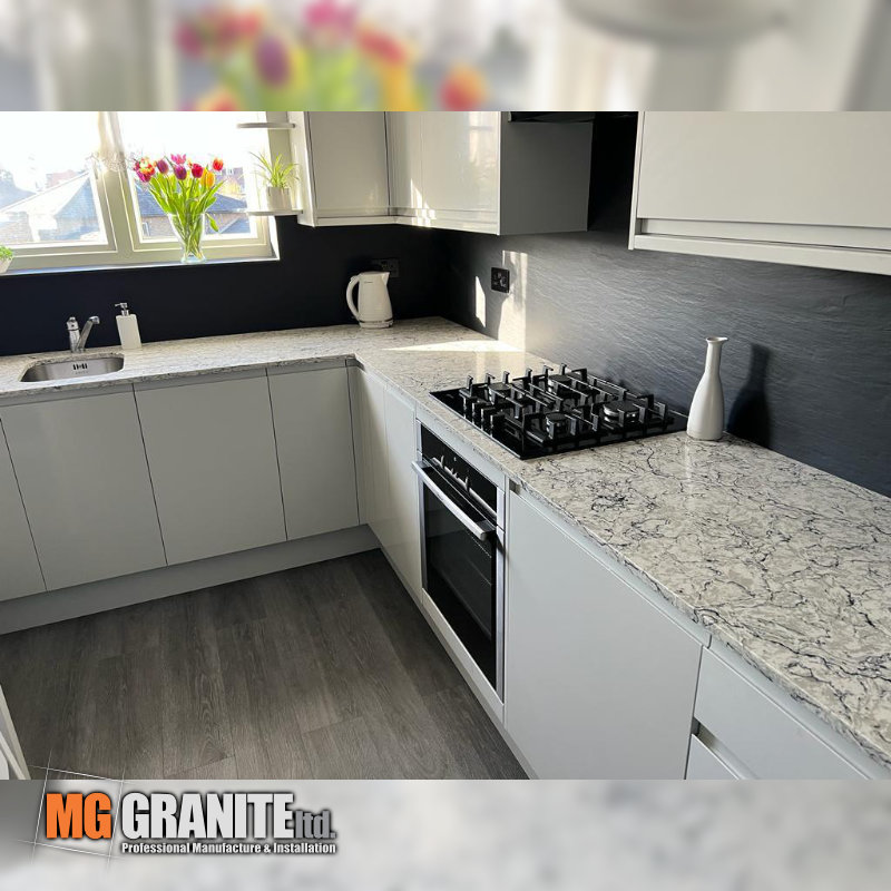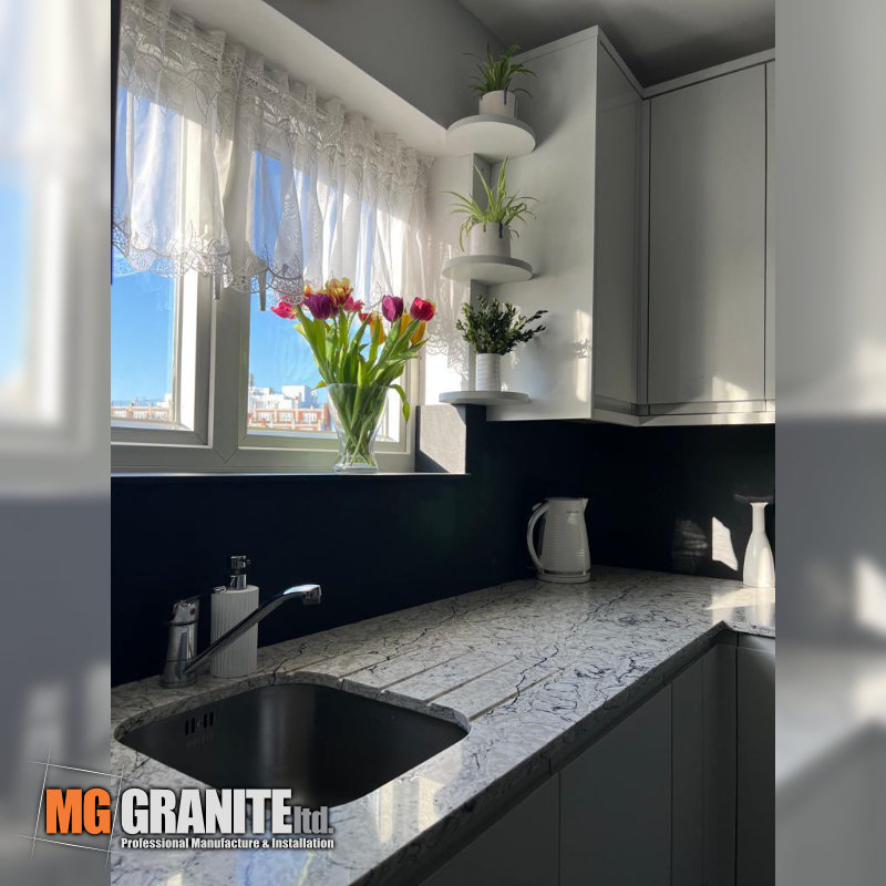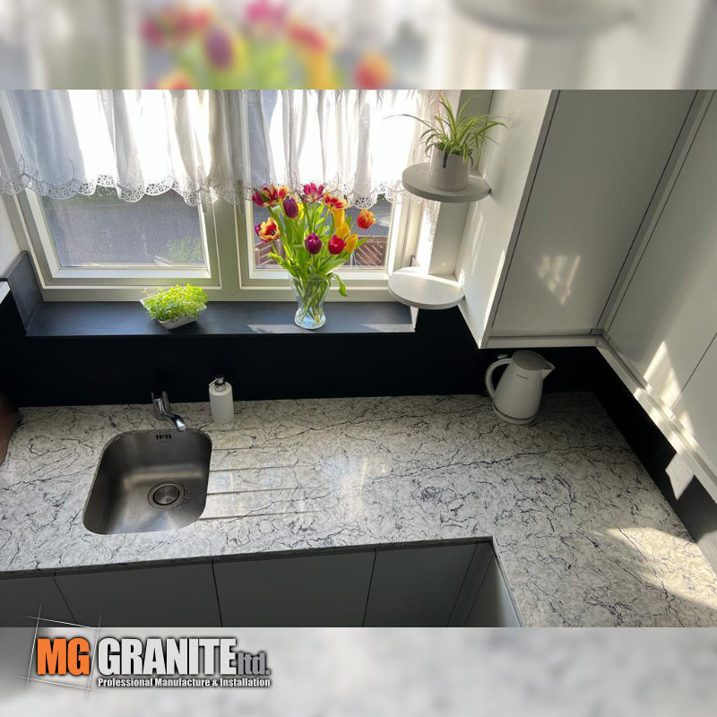 We’ve recently completed this beautiful kitchen in Barnes. Our team installed 20mm ⭐Atlantic Black Quartz worktops ⭐with kitchen sink cut-out and draining grooves.
