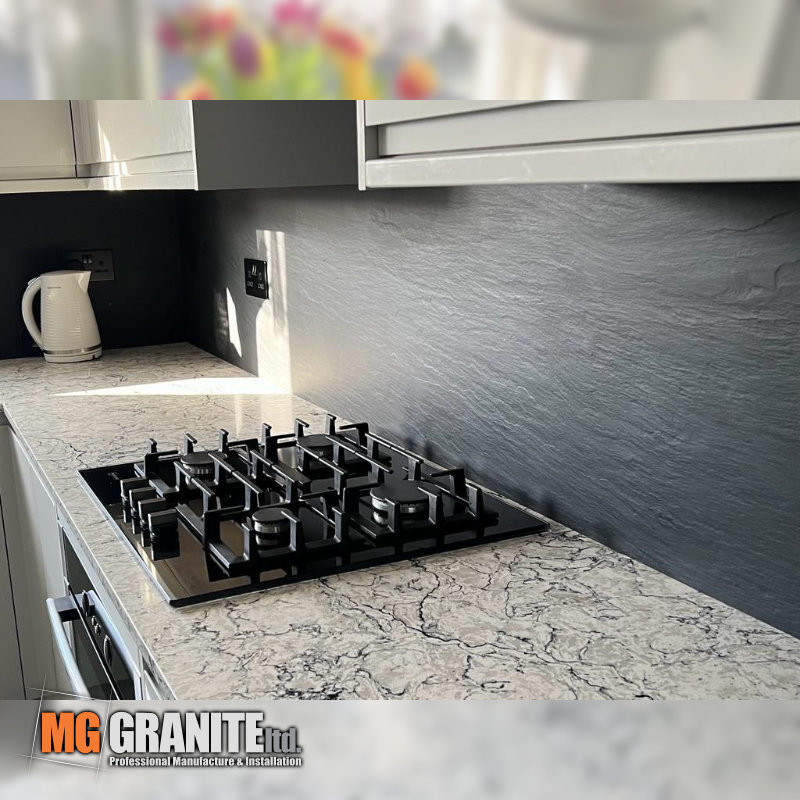 This new kitchen also has a 12mm Ardesia Nero a Spacco splashback with an interesting surface structure which fits nicely with the quartz worktop, black power sockets and light grey kitchen units.