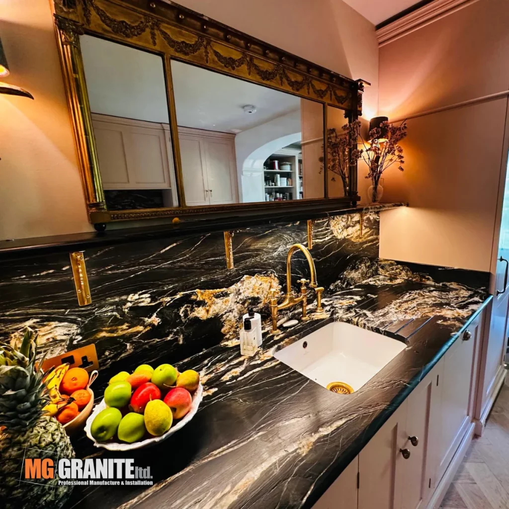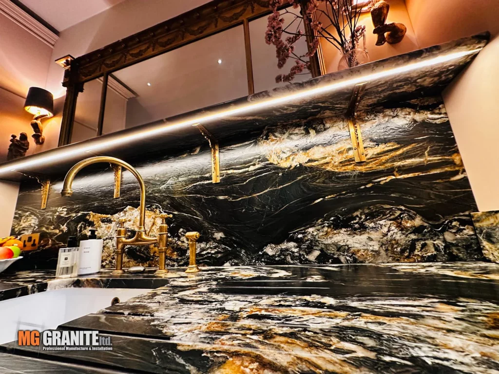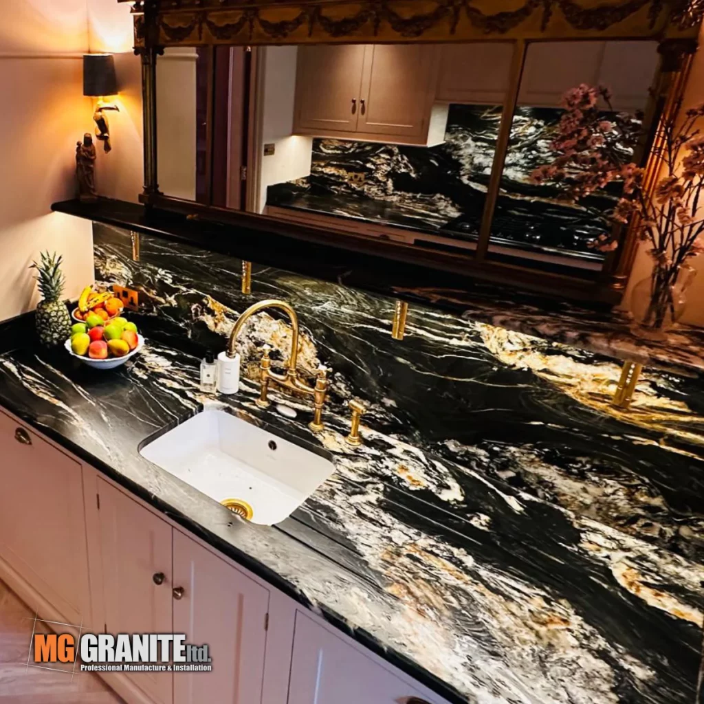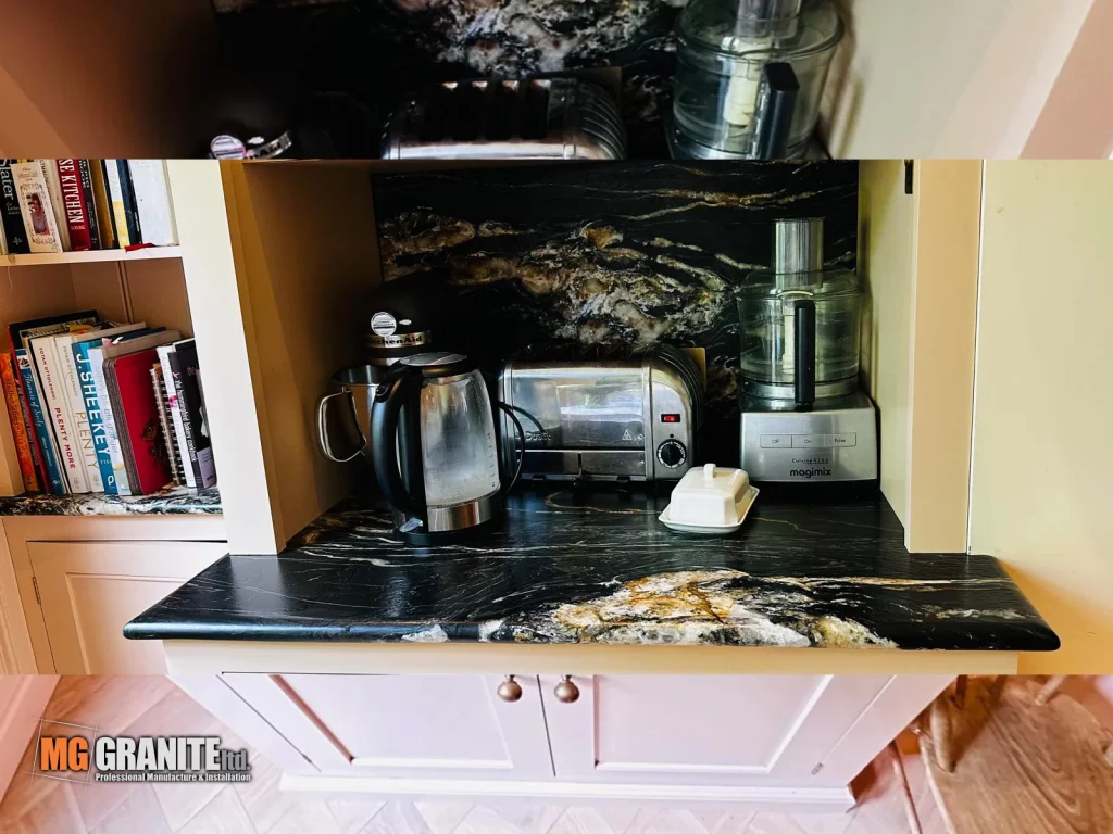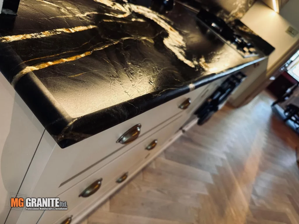Our client in London wanted to enhance their house with this gorgeous stone – very unique and luxurious which give it a unique and elegant appearance. Worktops cover the whole kitchen, as well as a cabinet in the dining room.