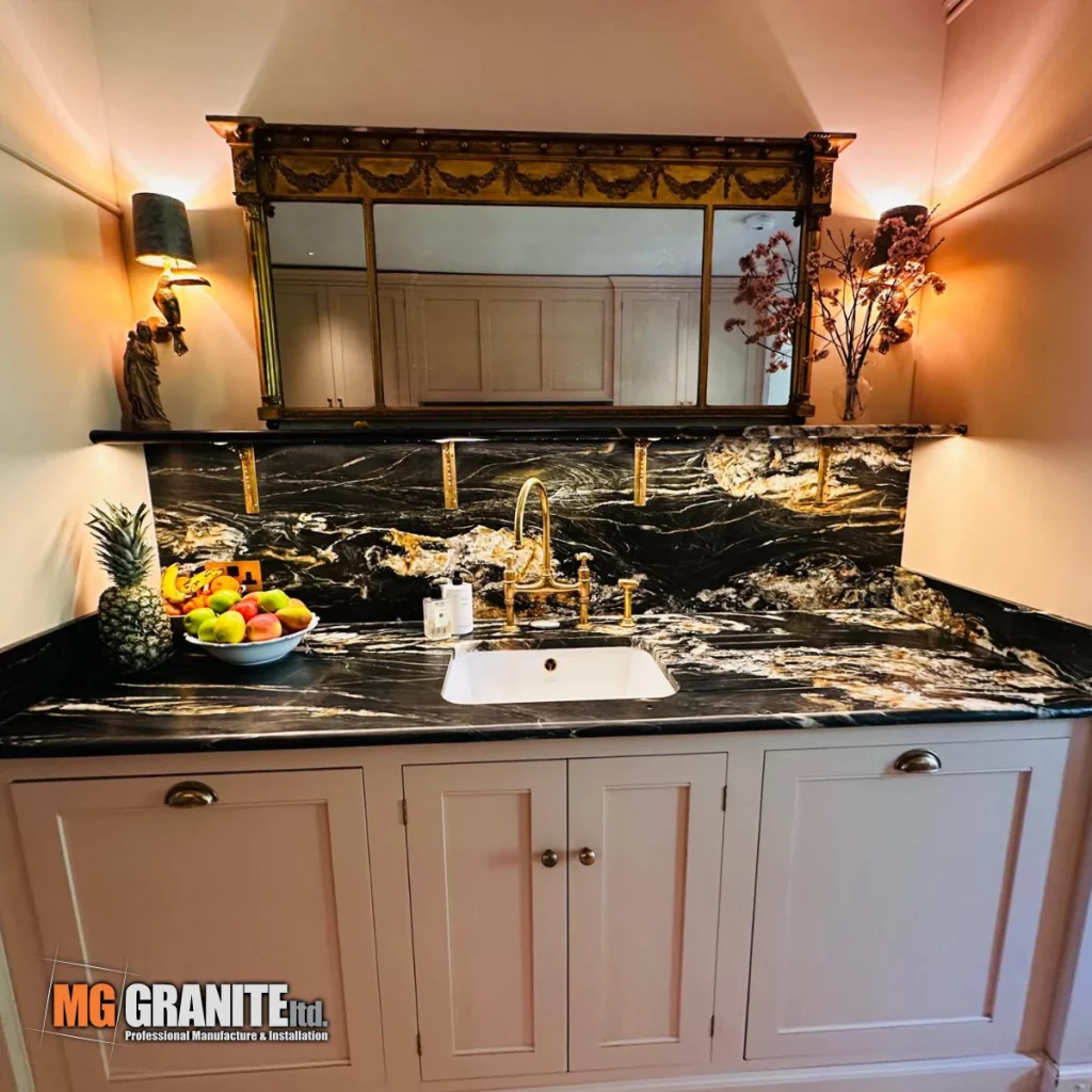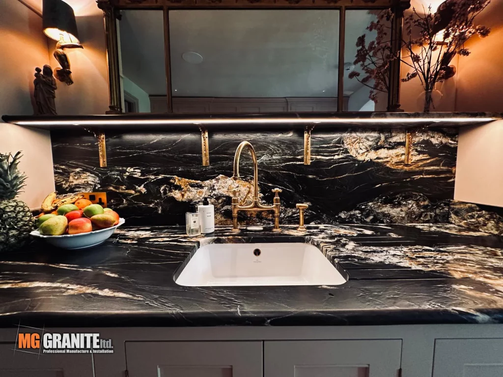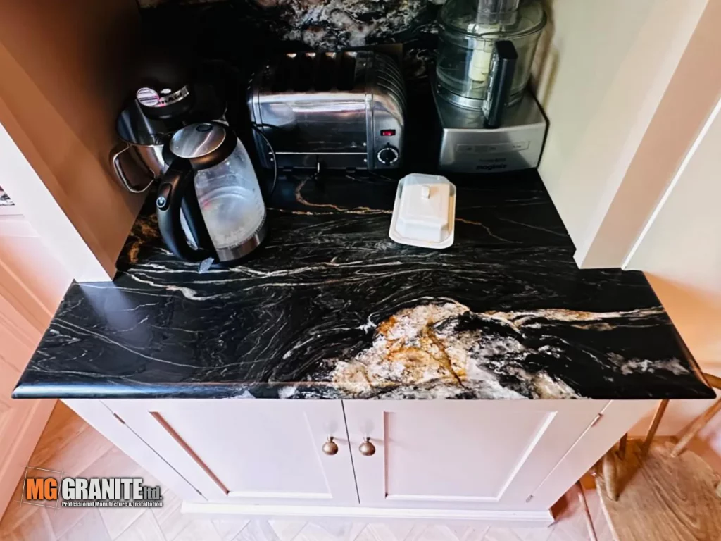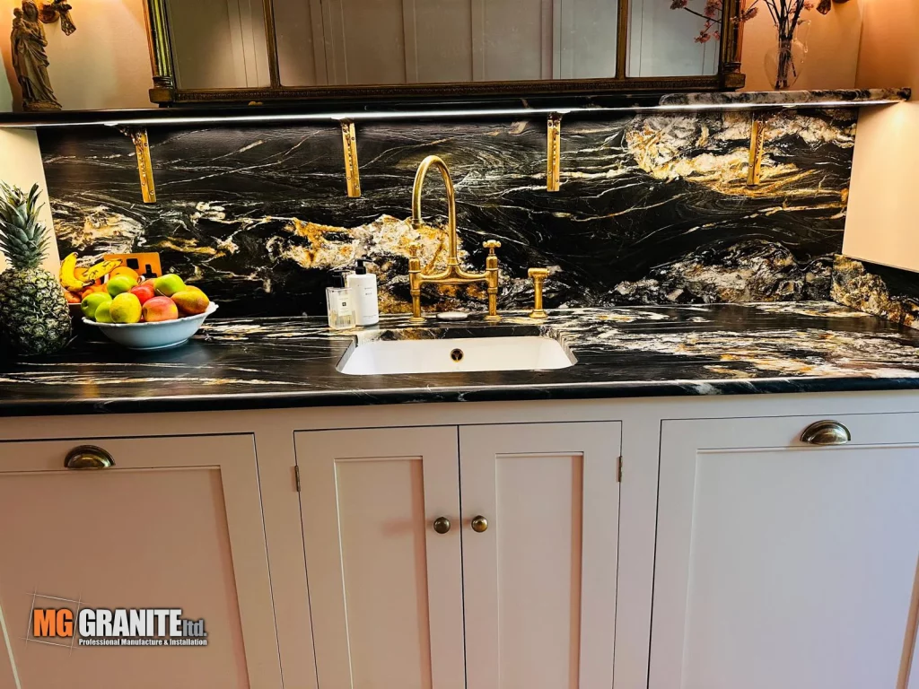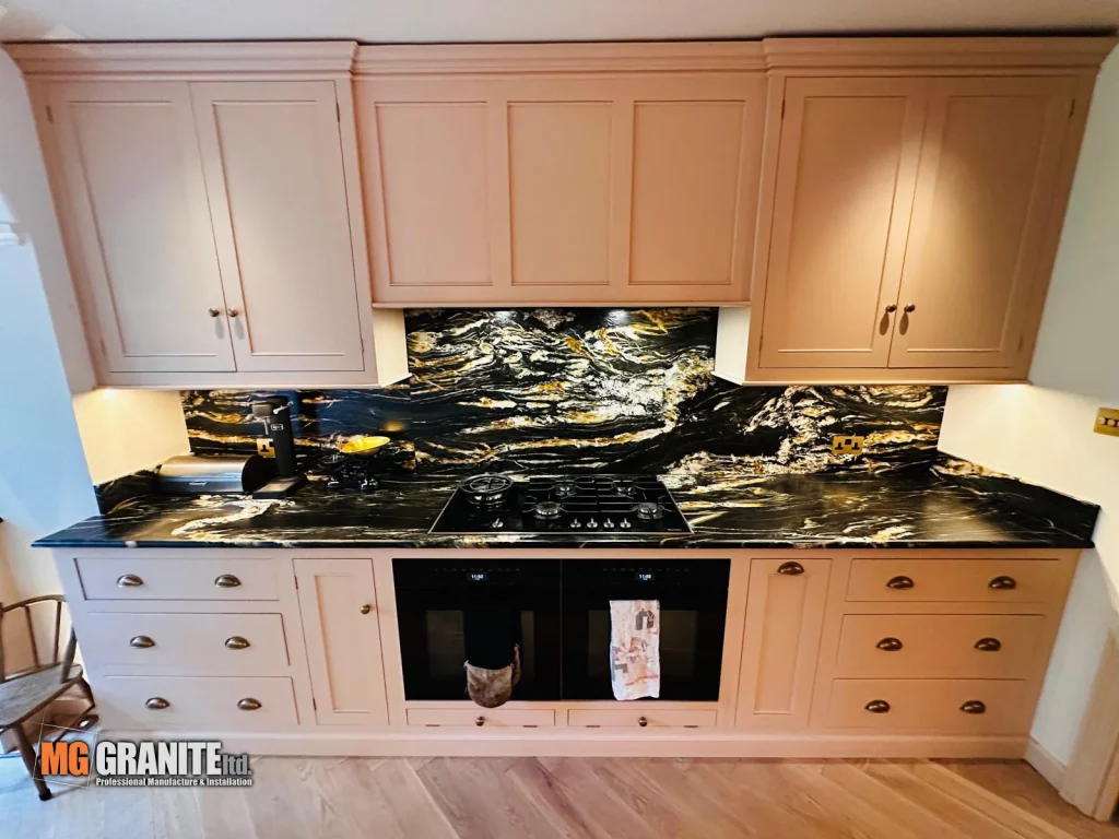 Our client in London wanted to enhance their house with this gorgeous stone – very unique and luxurious which give it a unique and elegant appearance. Worktops cover the whole kitchen, as well as a cabinet in the dining room.