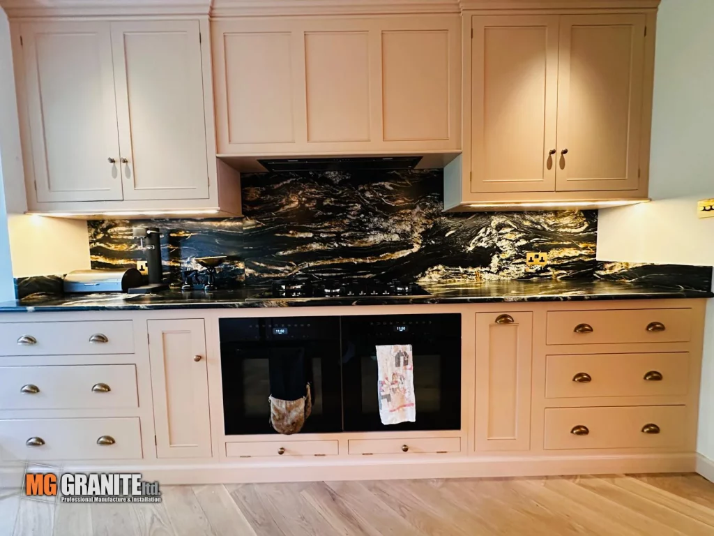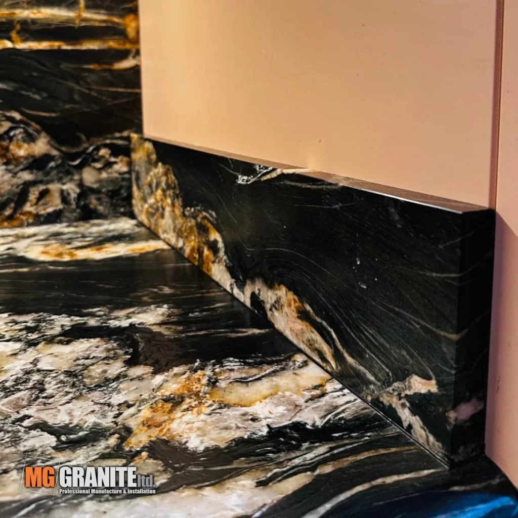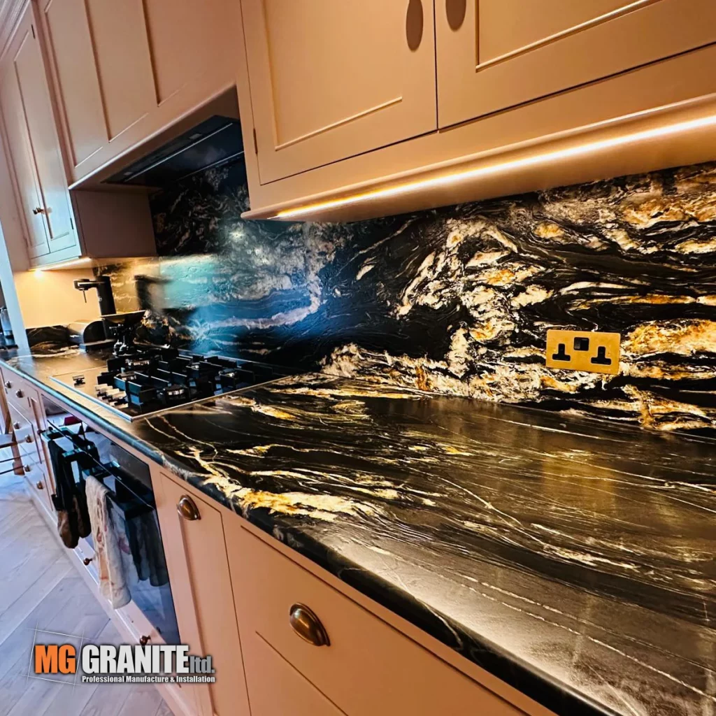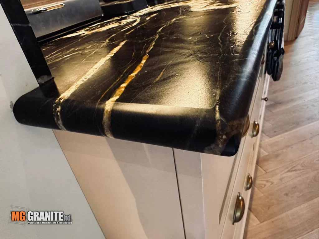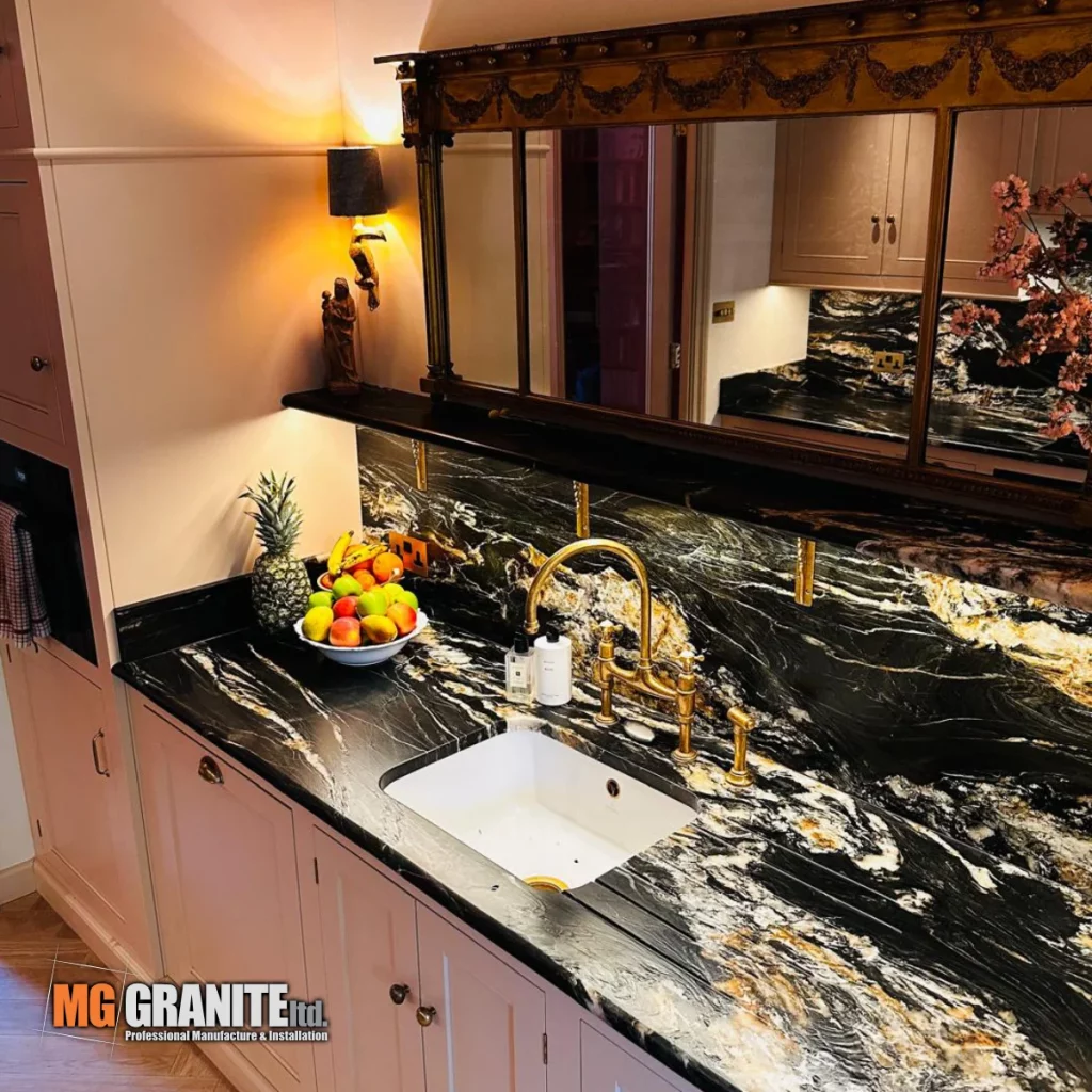 Our client in London wanted to enhance their house with this gorgeous stone – very unique and luxurious which give it a unique and elegant appearance. Worktops cover the whole kitchen, as well as a cabinet in the dining room.
