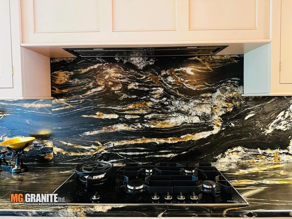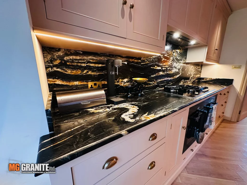 The worktops span the entire kitchen and include an undermount sink with draining grooves, a hob cut-out, and matching upstands and splashbacks. The kitchen combines functionality with high-end materials, creating a sophisticated and seamless look that is both practical and visually striking.