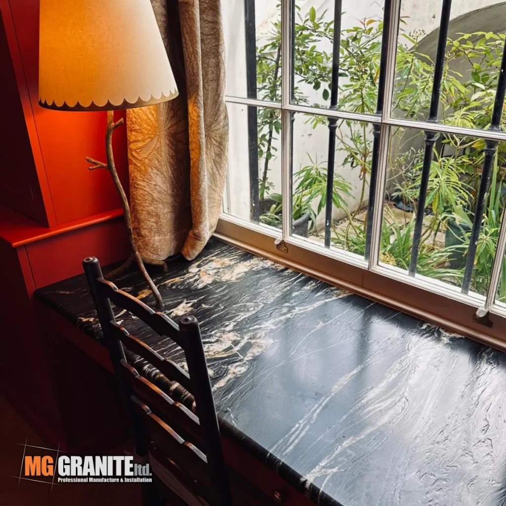 The design extends to a granite-topped desk in the dining area, maintaining the cohesive aesthetic.