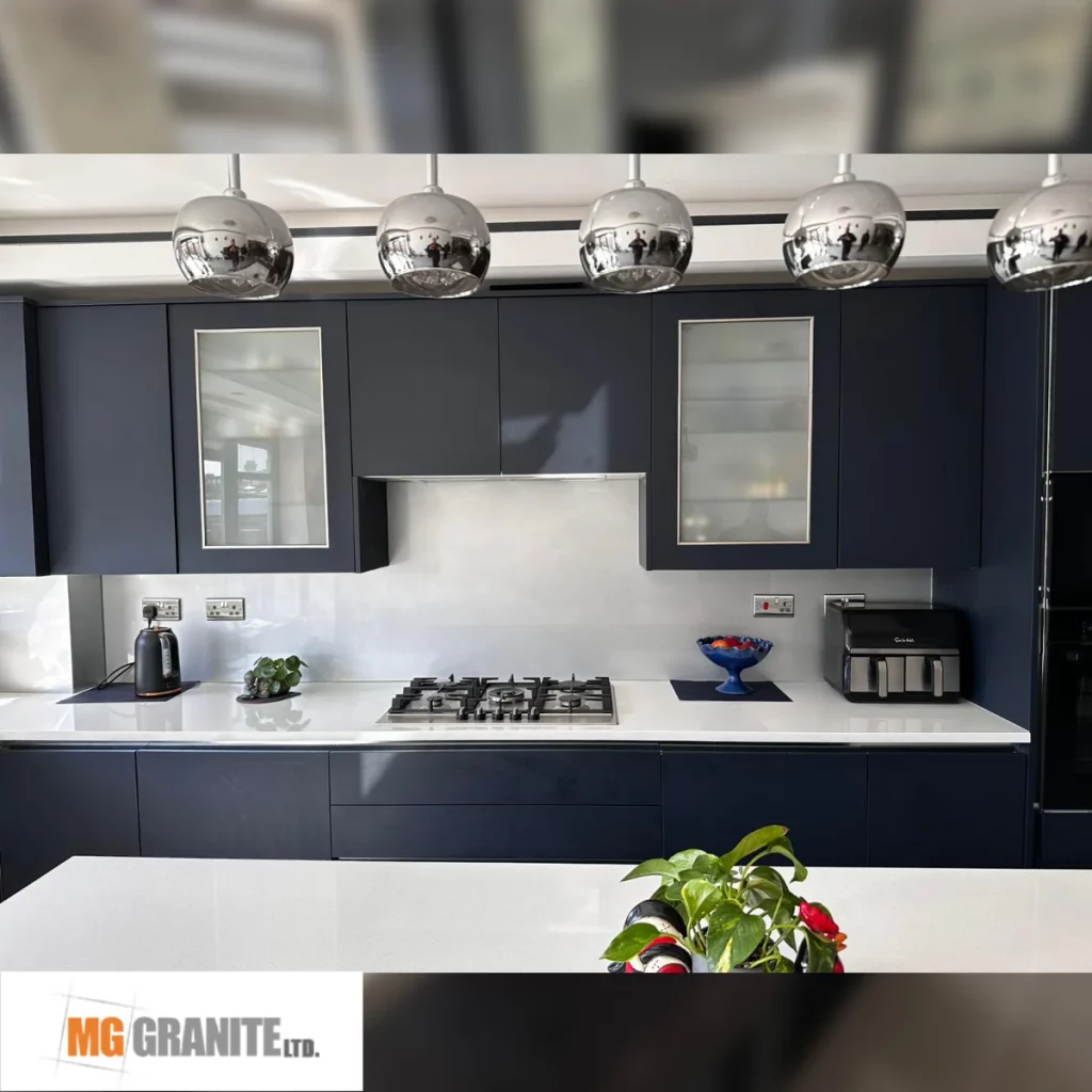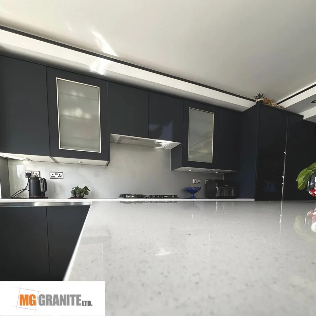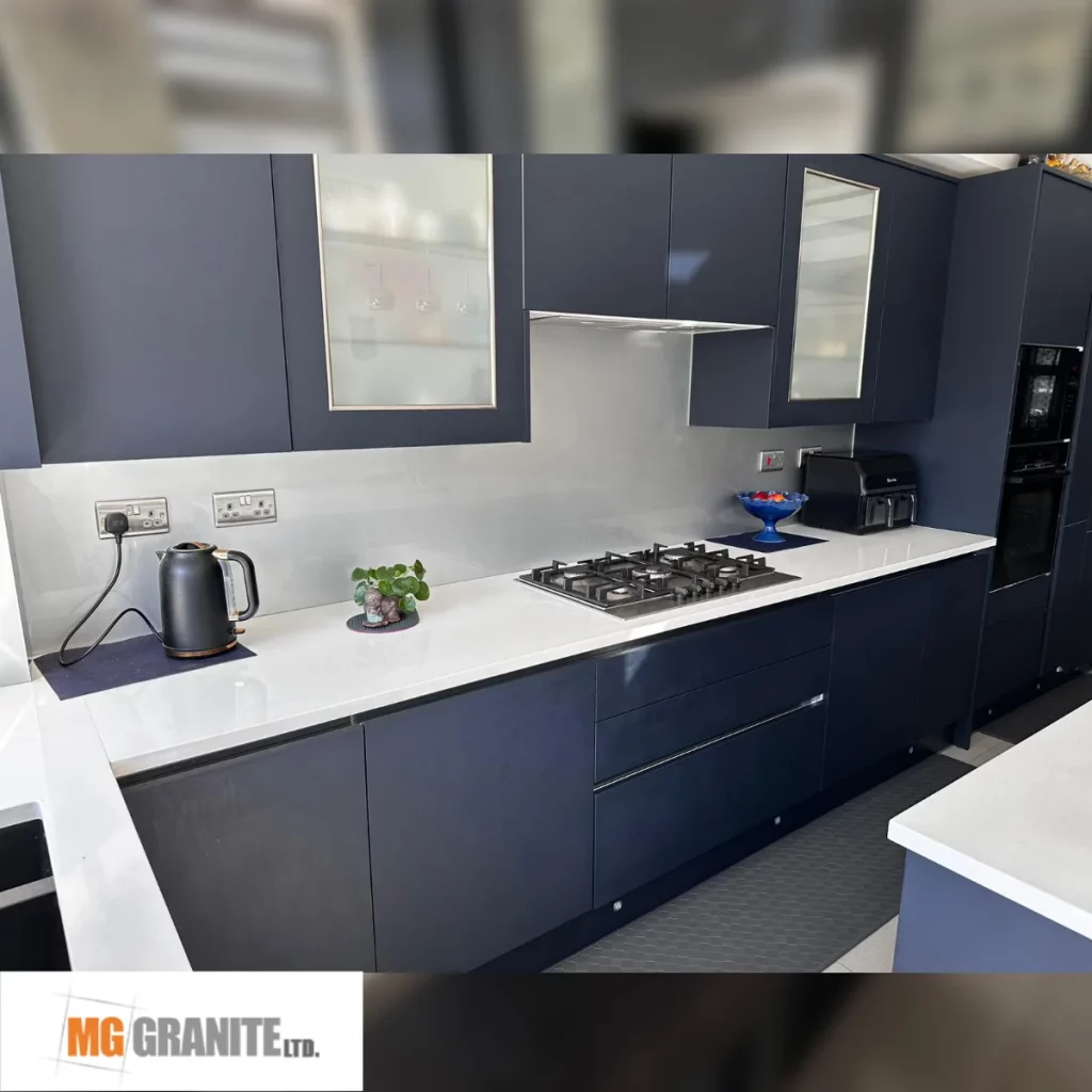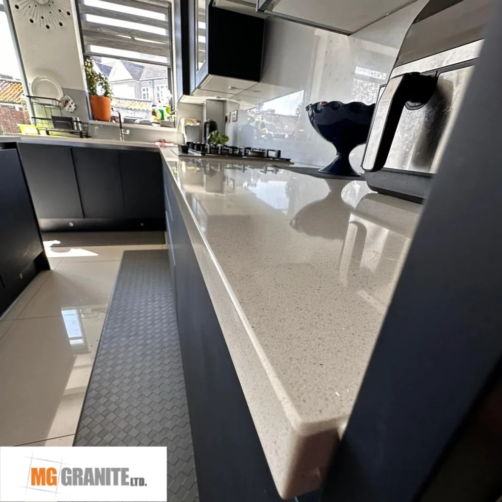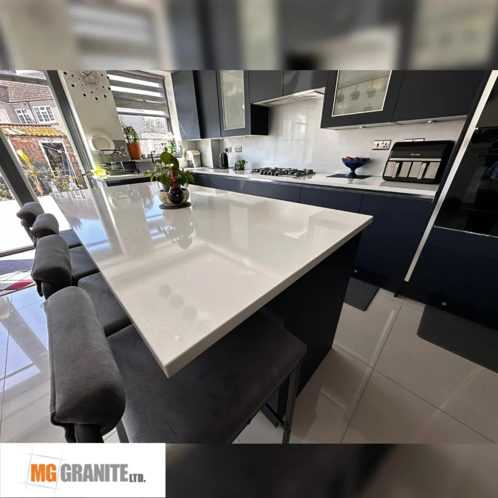 The design includes an island, undermount sink, window sills, and glass splashbacks, all crafted from the same quartz material. The worktops have square edges with rounded corners, creating a stylish and cohesive look.