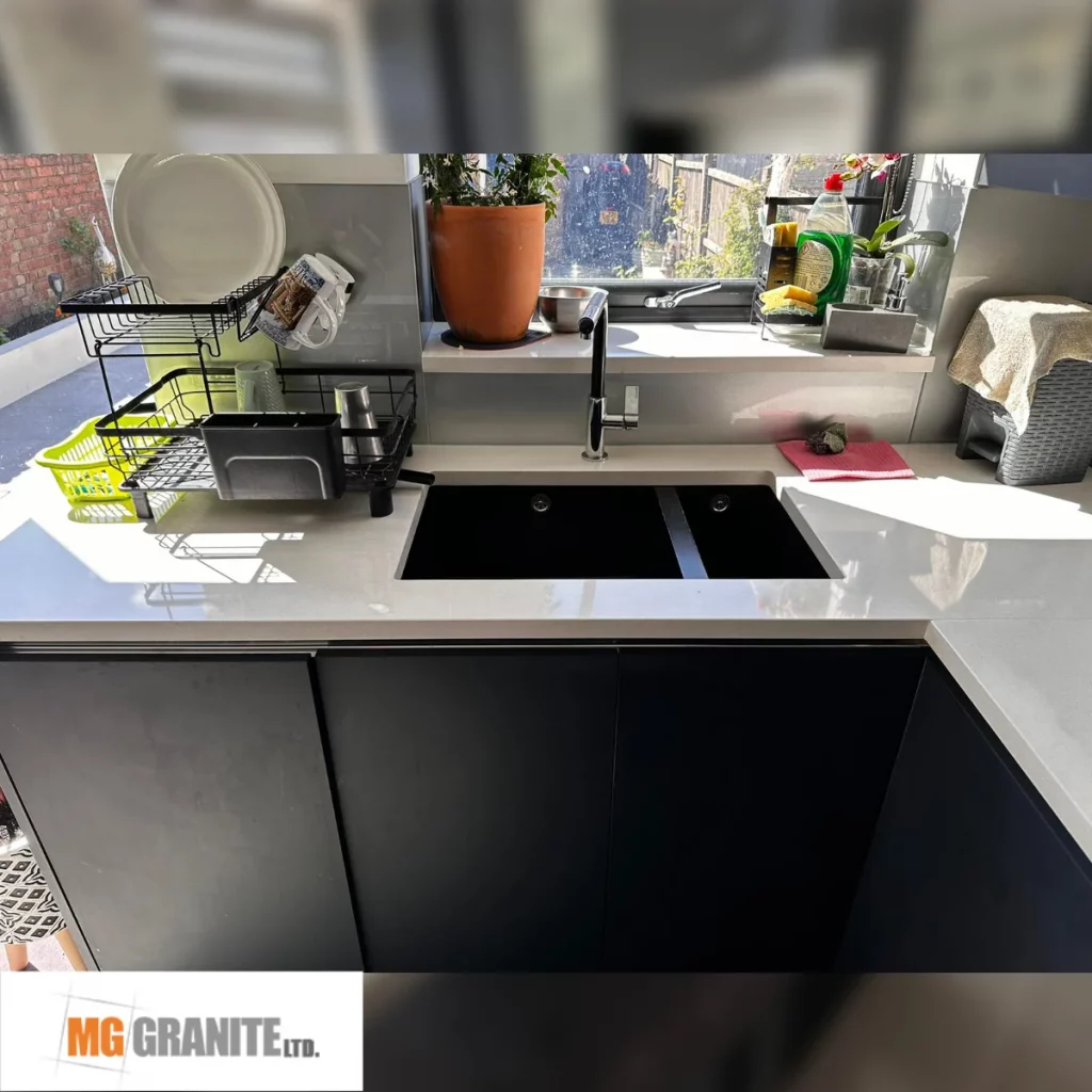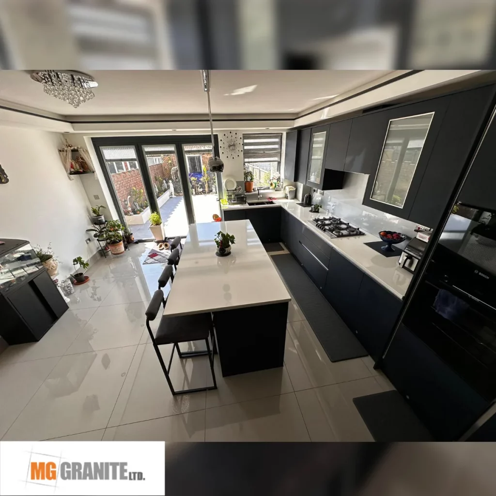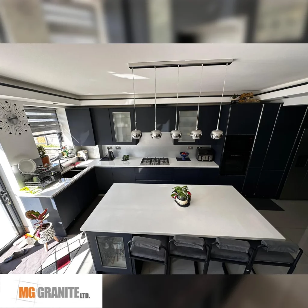 The quartz material extends to the window sills, maintaining a uniform appearance throughout the kitchen. The overall aesthetic is modern and sophisticated, emphasizing clean lines and high-quality finishes.