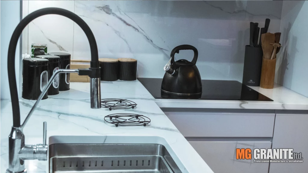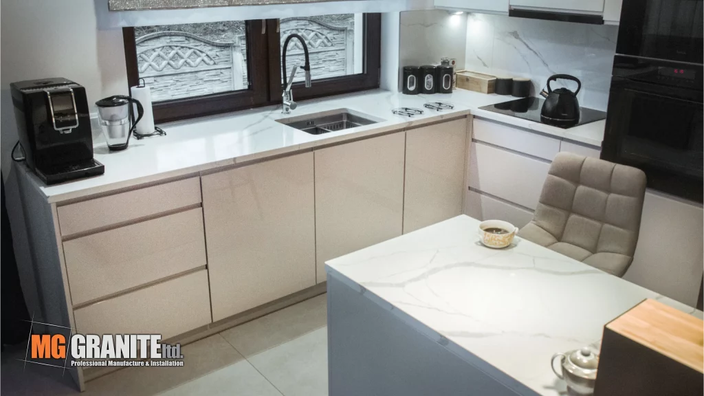 The quartz worktop, with its elegant white surface and subtle grey veining, adds a sophisticated touch to the space. The design emphasizes a harmonious blend of light and dark elements, incorporating black and brown kitchen accessories and appliances.