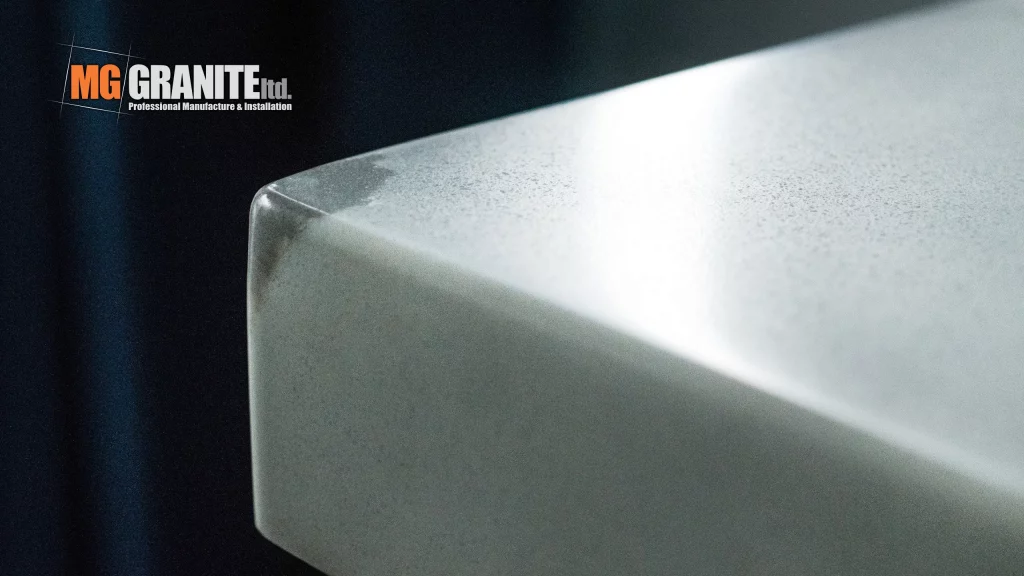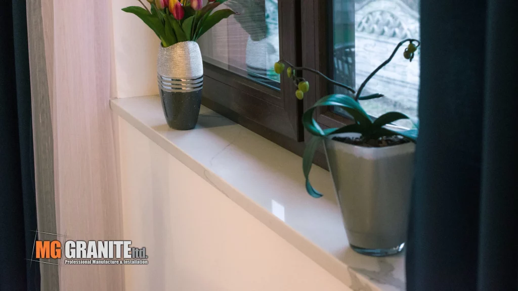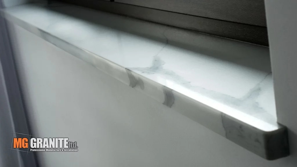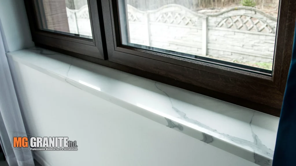 Key features include a hob cut-out, a sink cut-out, and a matching splashback, all contributing to a sleek and functional cooking area. The kitchen also has matching sills throughout the kitchen and dining area.