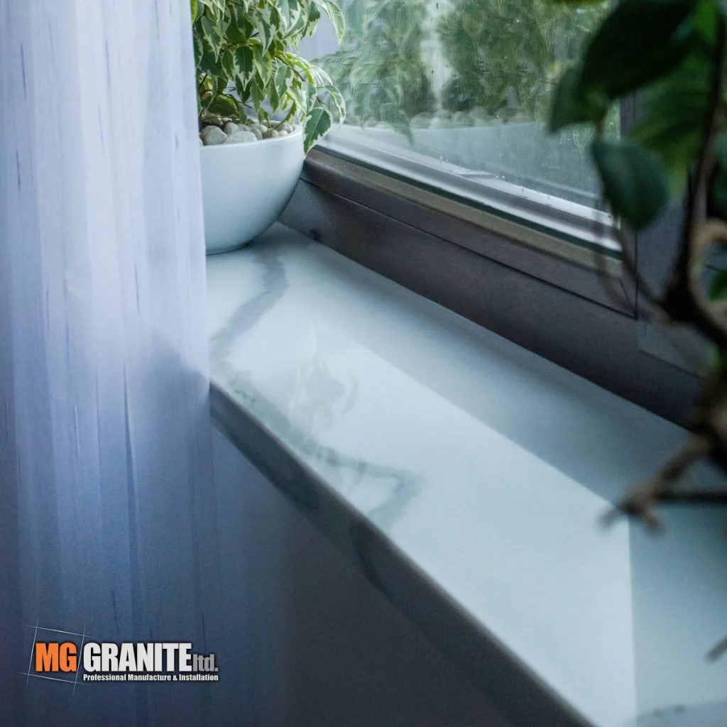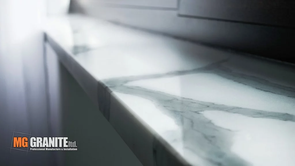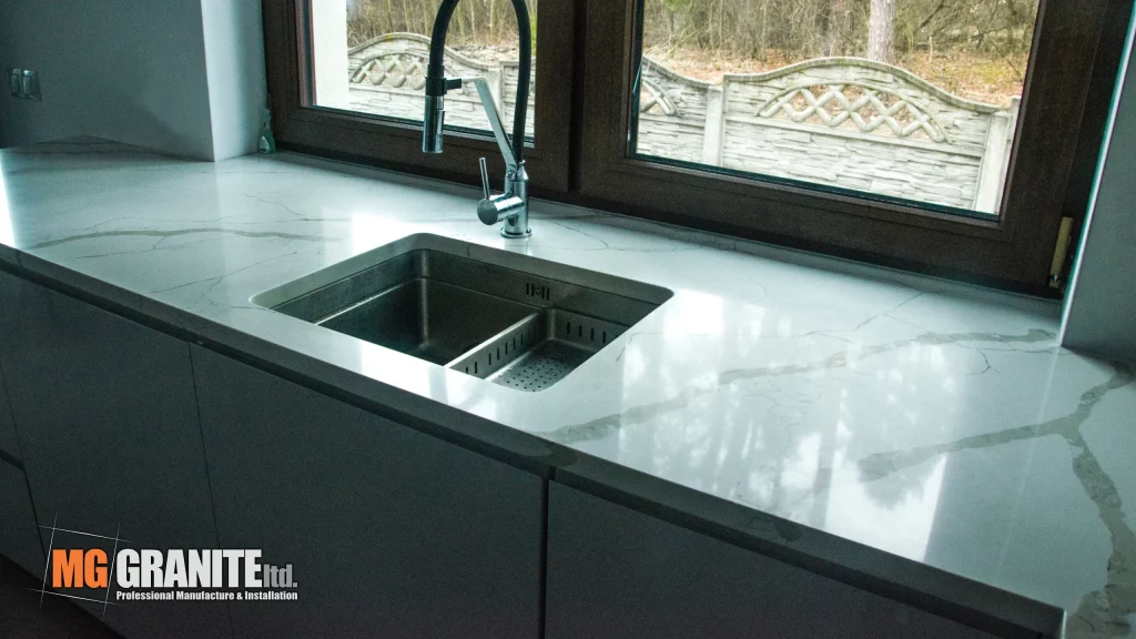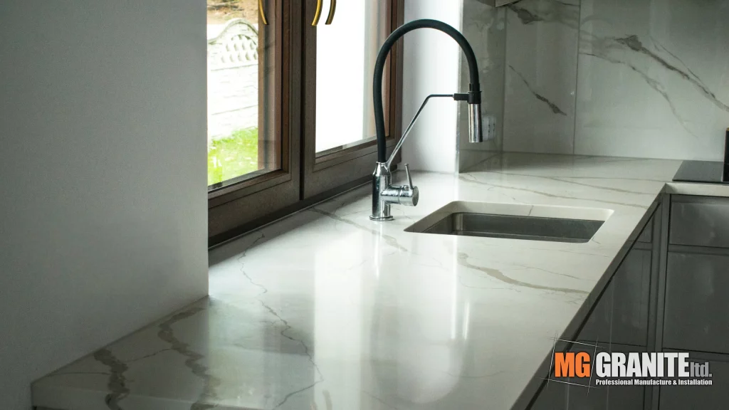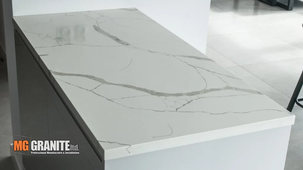 The kitchen features a contemporary design with Calacutta Venato quartz as the centerpiece.