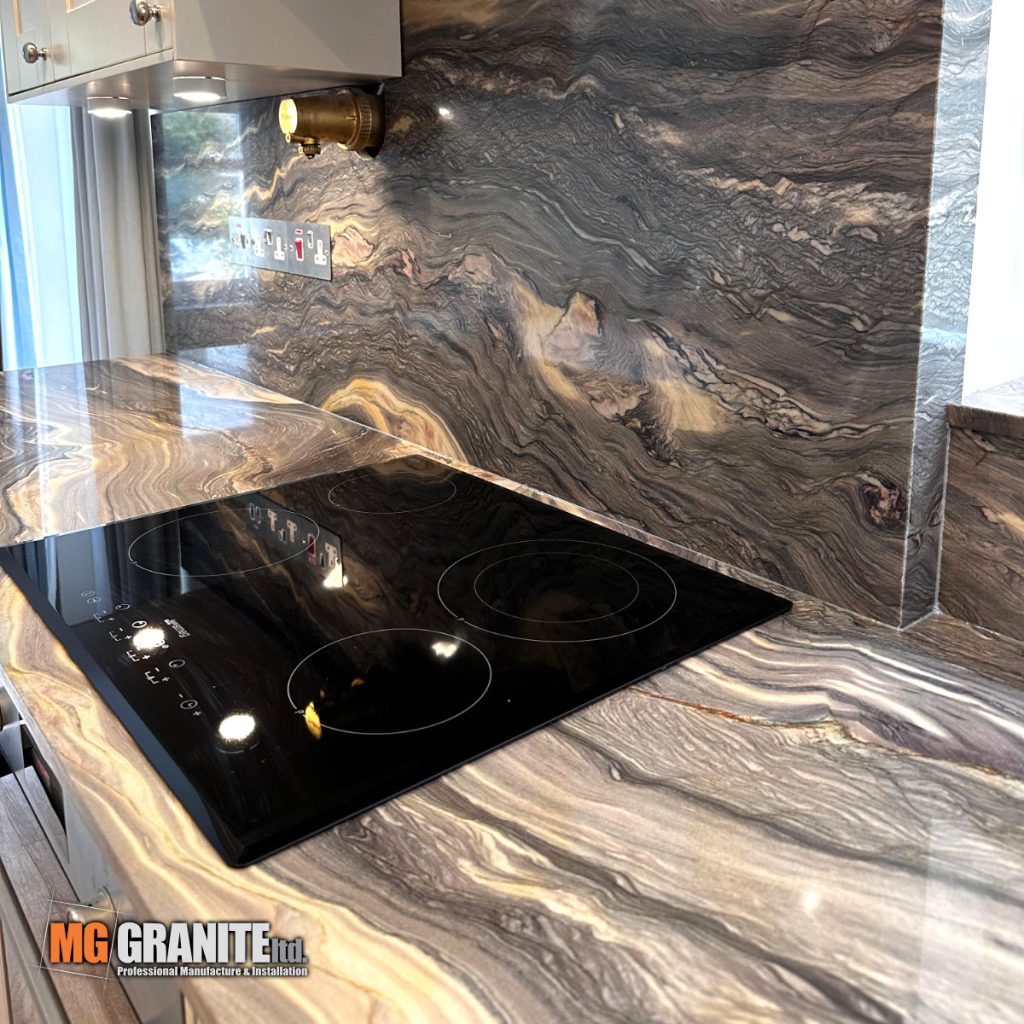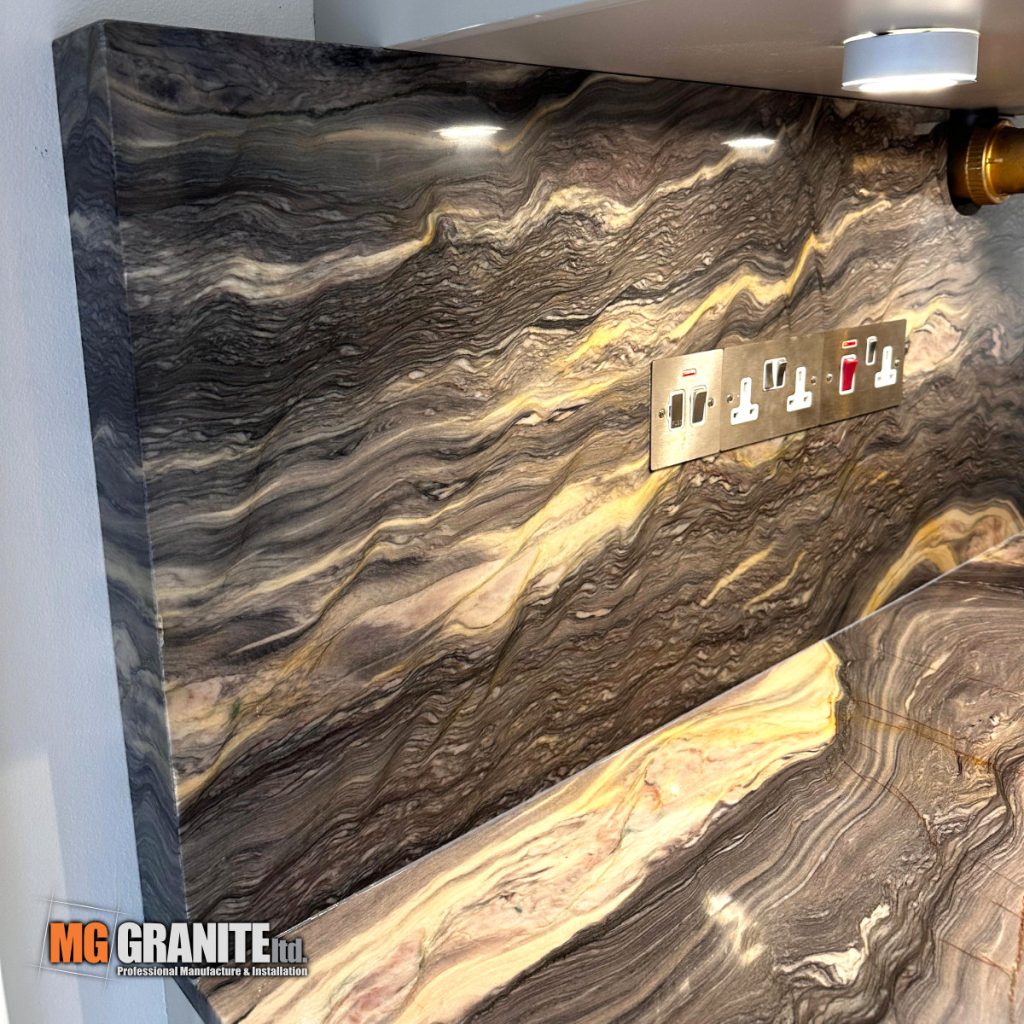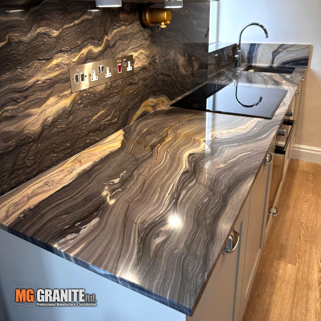 This recently completed kitchen project showcases the bold and elegant beauty of Fusion Quartzite, expertly fabricated and installed by MG Granite for a home in London. Known for its striking natural patterns and deep, flowing veining, Fusion Quartzite brings both character and timeless style to this modern kitchen space.