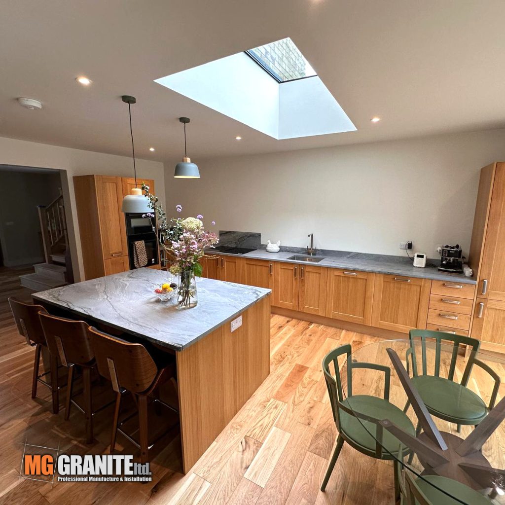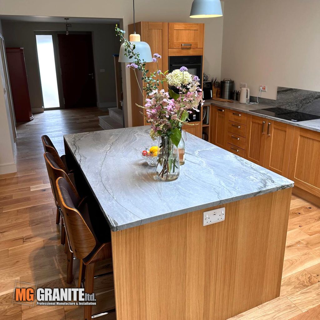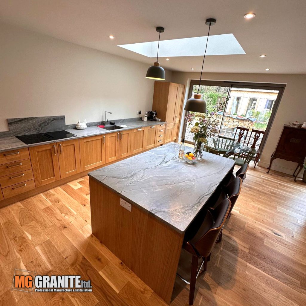 Kitchen with Sensa Platino Quartzite Worktops and an Island