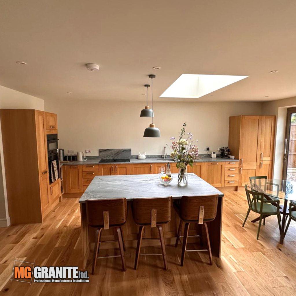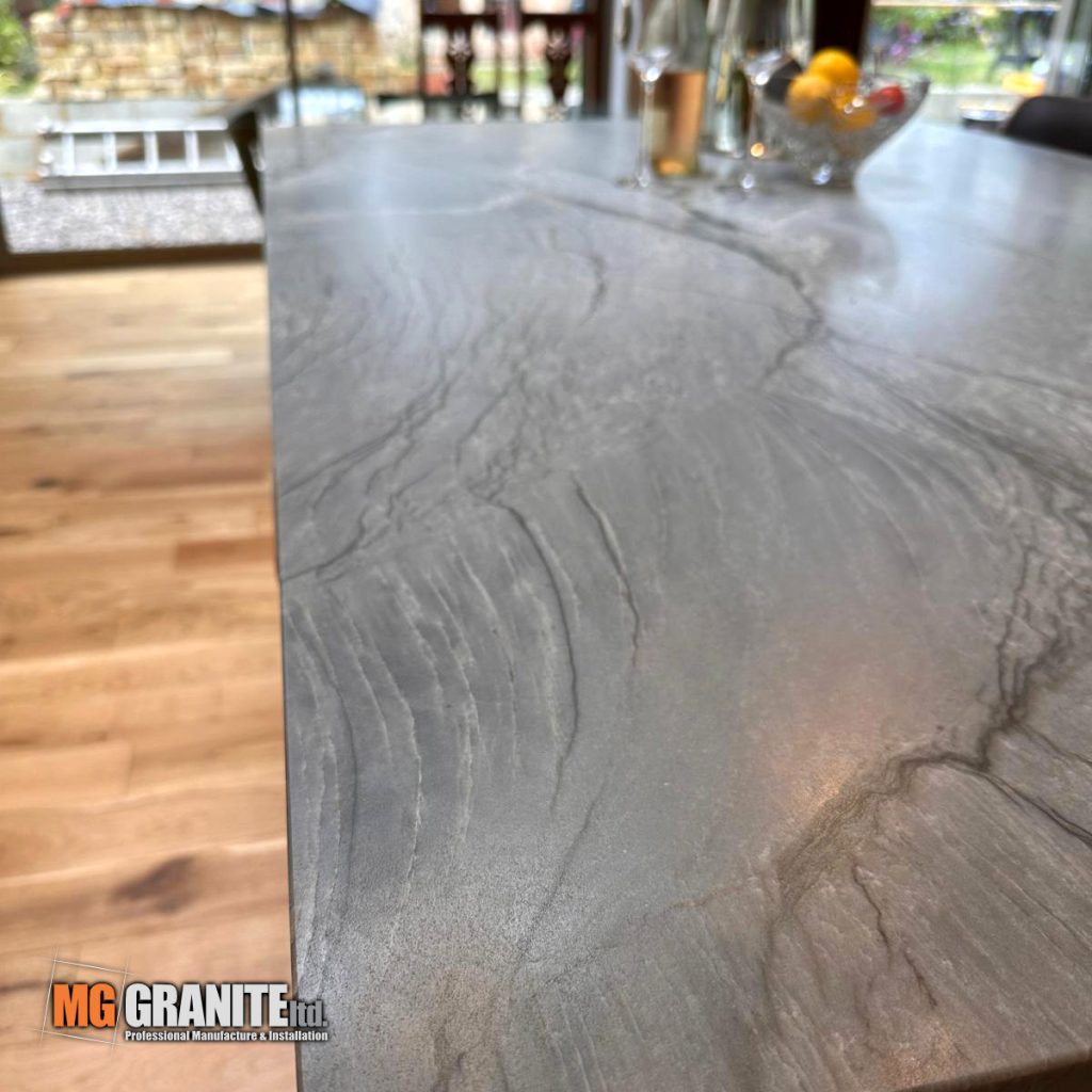 This gorgeous kitchen in Carshalton is complete. Cosentino installed 30mm Sensa Platino, a quartzite with a Textured Leather surface, in the wooden kitchen.