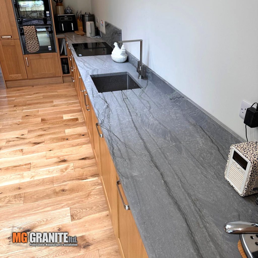 In order to provide a space for the homeowner to use in the kitchen, the project included a long quartzite countertop with sink and hob cuts.