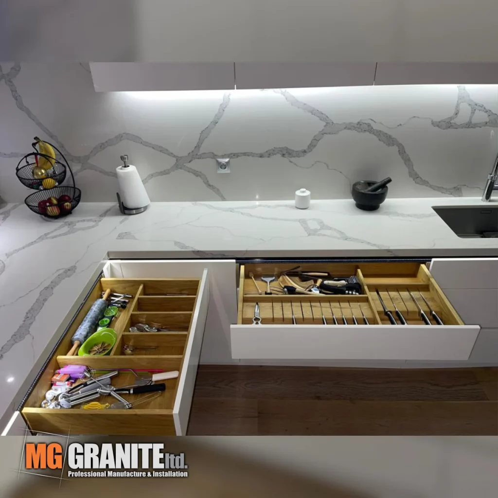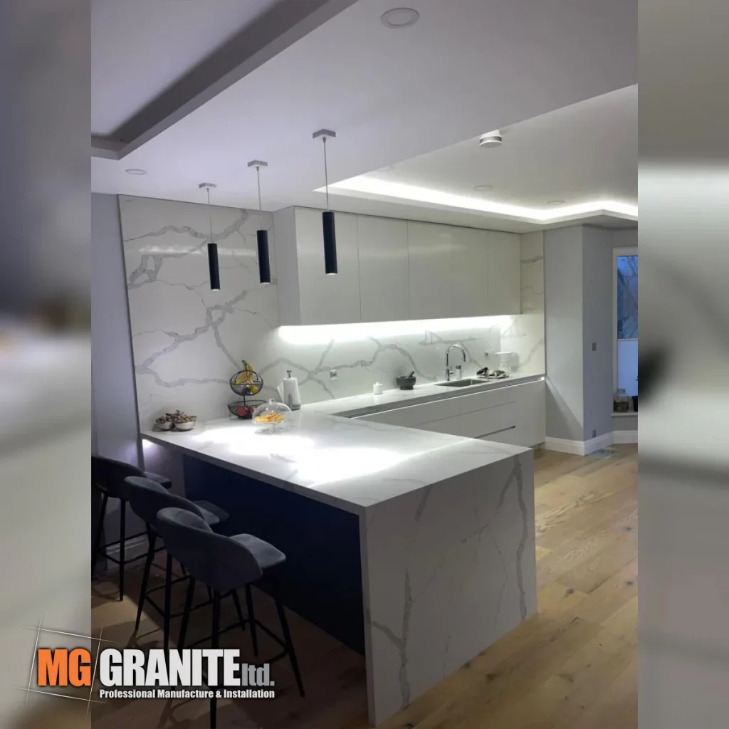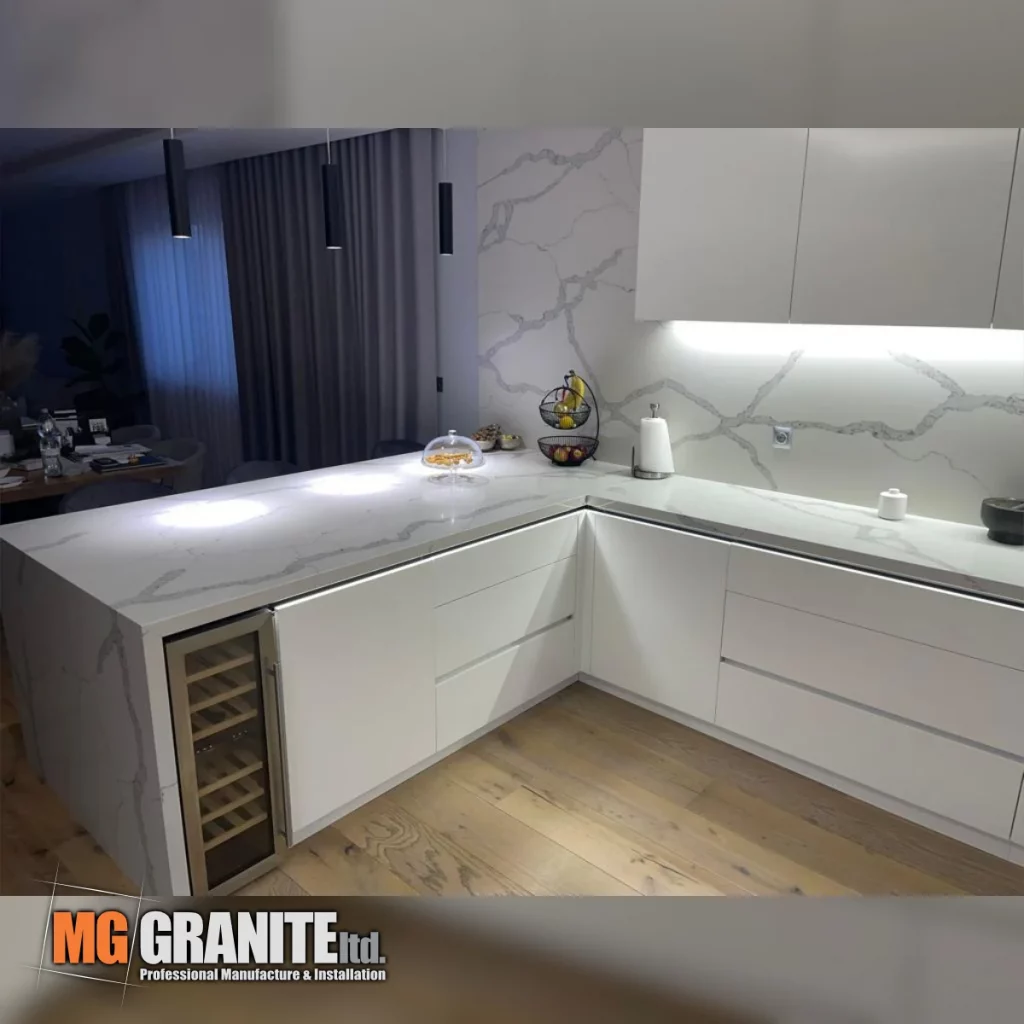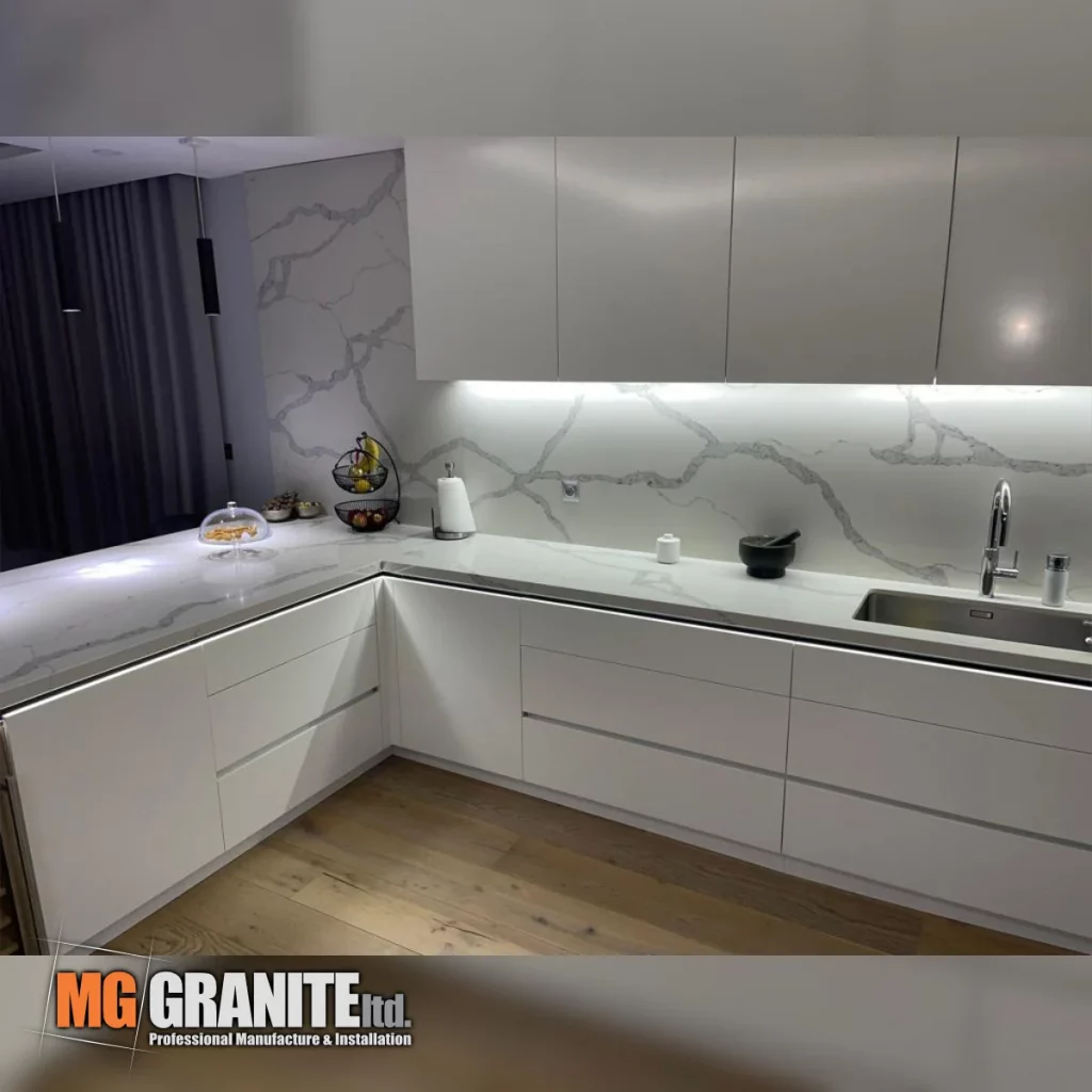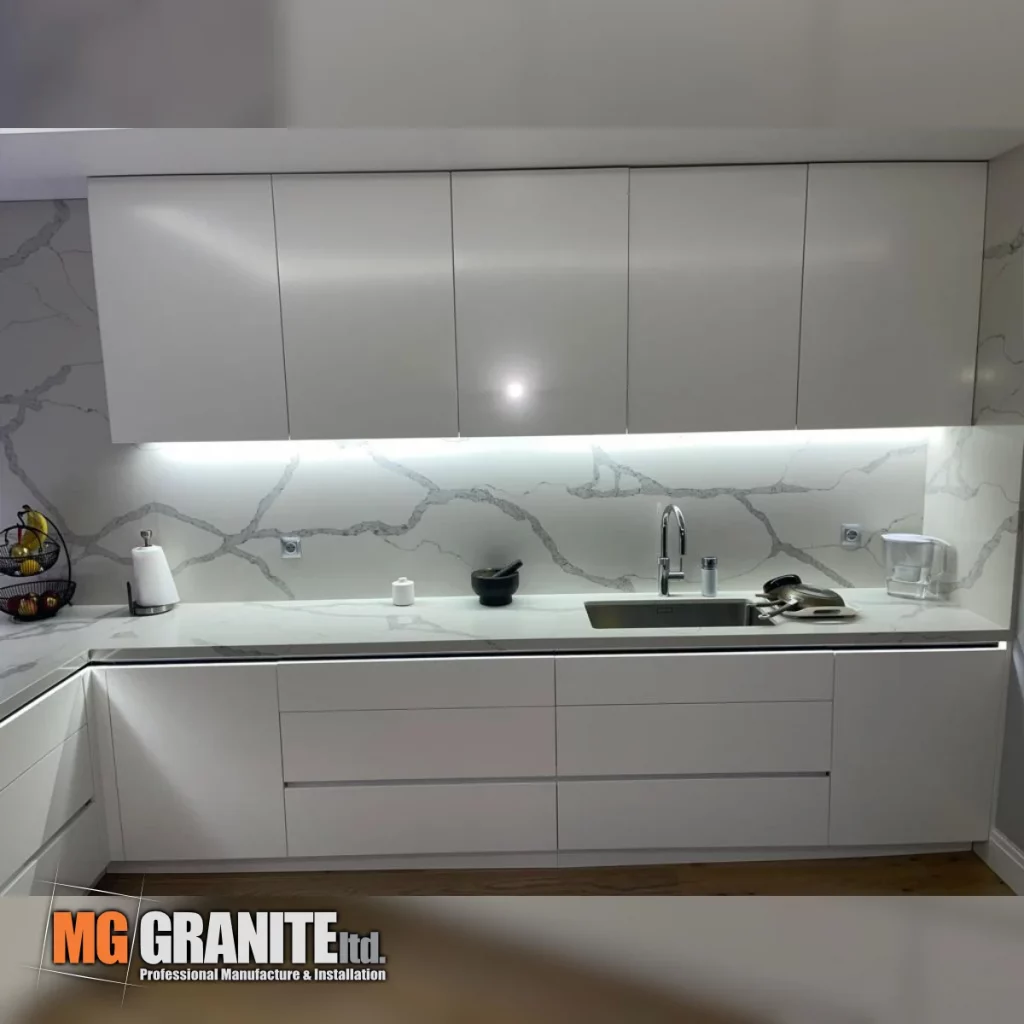 The kitchen features a stylish, modern design using white quartz with grey veins. The worktops and end panels are constructed with mitred joints, ensuring a seamless appearance. An undermount sink is integrated into the worktop, contributing to the clean lines of the design.